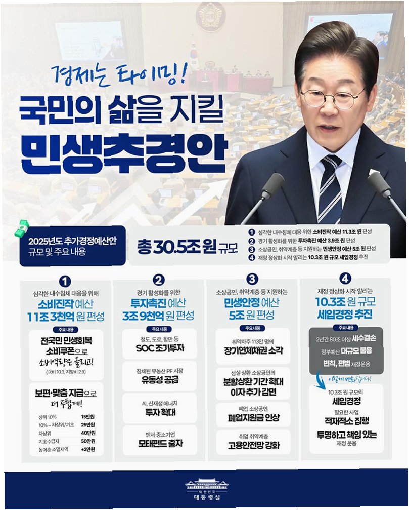 추경안의 핵심 중 하나는 소비쿠폰 형식의 전 국민 민생회복지원금입니다. 이번에 가결된 예산은 정부안보다 1조 8742억 원 증액된 12조 1709억 원으로, 국민들의 소비를 진작하고, 침체된 경제에 활력을 불어넣는 데 기여할 것으로 보입니다. 소비쿠폰은 지역 경제 활성화에도 긍정적인 영향을 미칠 것으로 기대되며, 소상공인과 자영업자들에게도 실질적인 도움을 줄 수 있을 것입니다. 이처럼 소비쿠폰은 단순한 금전적 지원을 넘어, 우리 사회의 경제 생태계를 건강하게 만드는 중요한 역할을 수행할 것입니다.
